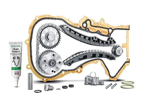 Schaeffler's INA Timing Chain Kit is a comprehensive, precision-matched solution for chain-driven timing systems. Each kit is tailored to the specific vehicle and includes the timing chain, tensioner (hydraulic or mechanical), guides, sprockets, seals, accessories, and the bonus Schaeffler Chain Protect additive.